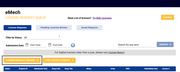 You may also use the License/Request Inquiry option found on the dashboard which will take you to a search screen where you can search for requests by certain criteria.