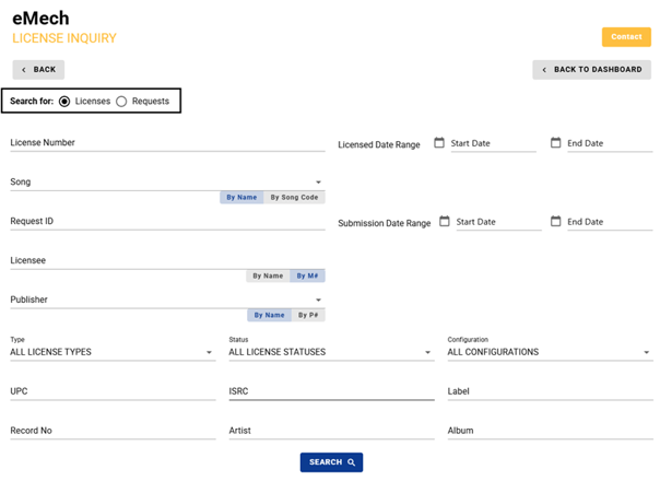 Note: Use the toggle function on the License/Request Inquiry screen to search for either licenses or pending requests. Licensed requests will only appear if the search toggle is set to Licenses. Pending requests will only appear if the search toggle is set to Requests.