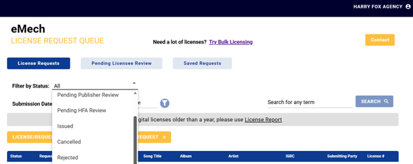 To check the status of your license request(s) in eMechanical, you may use the Filter option on the dashboard to view requests with the specified status.